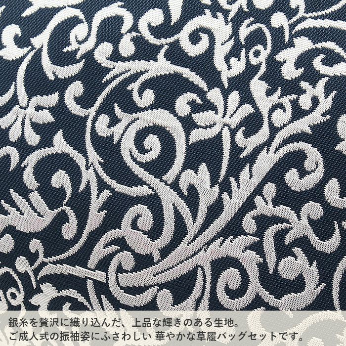 成人式や結婚式の華やかな振袖に合わせたい草履バッグセット 草履バッグセット 成人式 振袖用 フリー Lサイズ 黒 青 洋唐草 ダマスク 正絹 彩小路 3枚芯 ハイヒール がま口 日本製