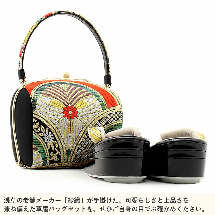草履バッグセット 成人式 振袖用 <紗織> Sサイズ Mサイズ Lサイズ LLサイズ 日本製 正絹帯地 <2色展開/菊に七宝花菱>