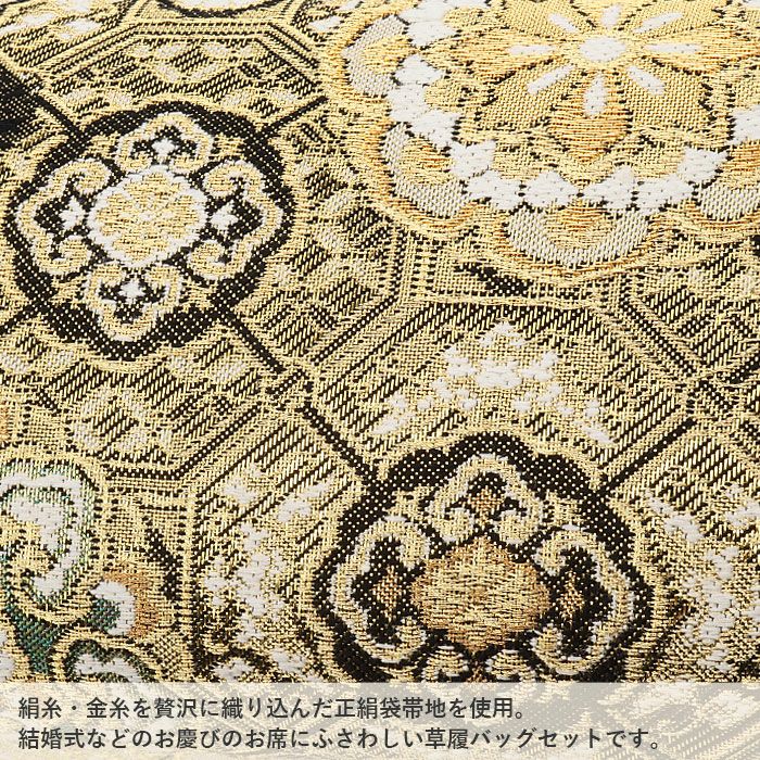 草履バッグセット 礼装用 フリーサイズ 正絹帯地 <黒×シャンパンゴールド/七宝に華紋> 日本製