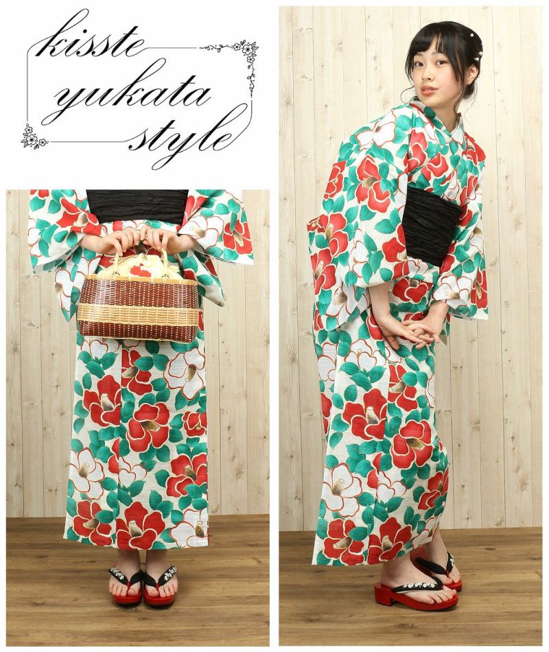 春の汗ばむ陽気から真夏、残暑の秋まで着られる 浴衣 着物 洗える 単衣 セオアルファ 夏着物 裄丈68 薄物 セオα 日本製 単品 きもの道楽 クリーム地に赤橙 緑系 椿 セオα
