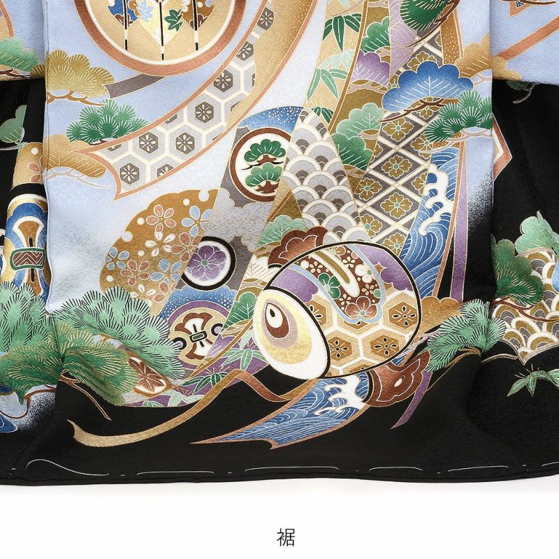 ≪在庫限り≫ 男の子 赤ちゃんのお宮参りの着物 産着 お宮参り 着物 男の子 産着 祝い着 黒 ブラック 水色 宝船 兜 富士山 立波 宝尽くし 三つ矢 武具 正絹 友禅 金刺繍 刺繍 金彩 日本製 新品 販売 購入