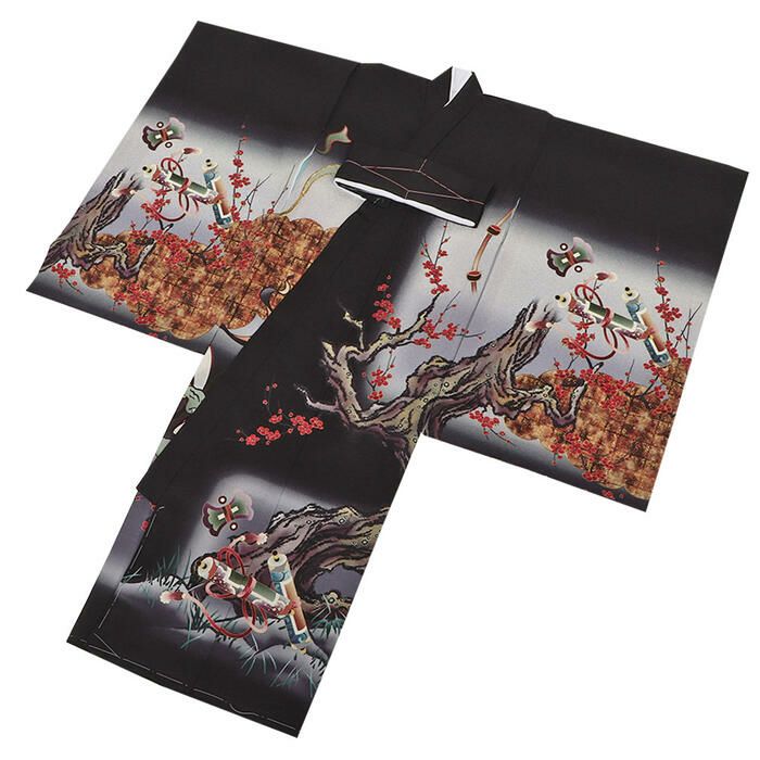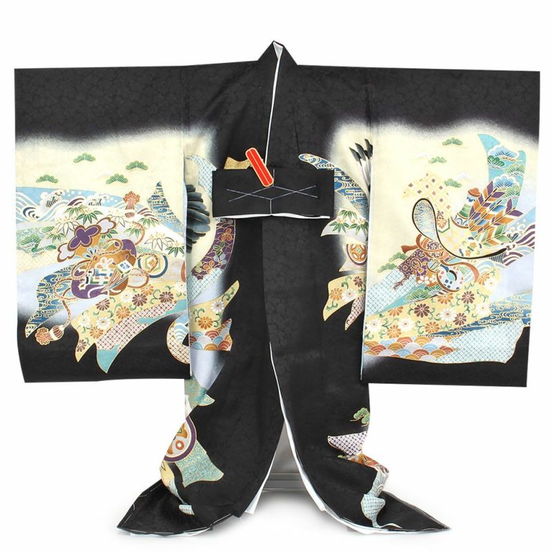 ≪在庫限り≫ 男の子 赤ちゃんのお宮参りの着物 お宮参り 着物 男の子 絹 正絹 掛け着 産着 黒 兜 鏡裏文 鼓 軍配 鞍橋 馬具 松竹 立波 吉祥紋 友禅 刺繍 金彩 新品 販売 購入 きもの 祝い着