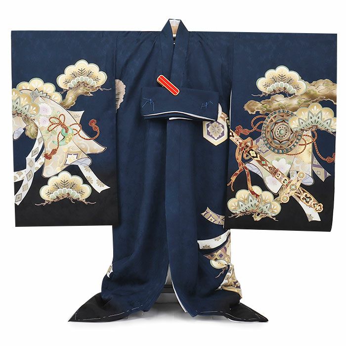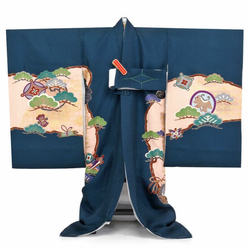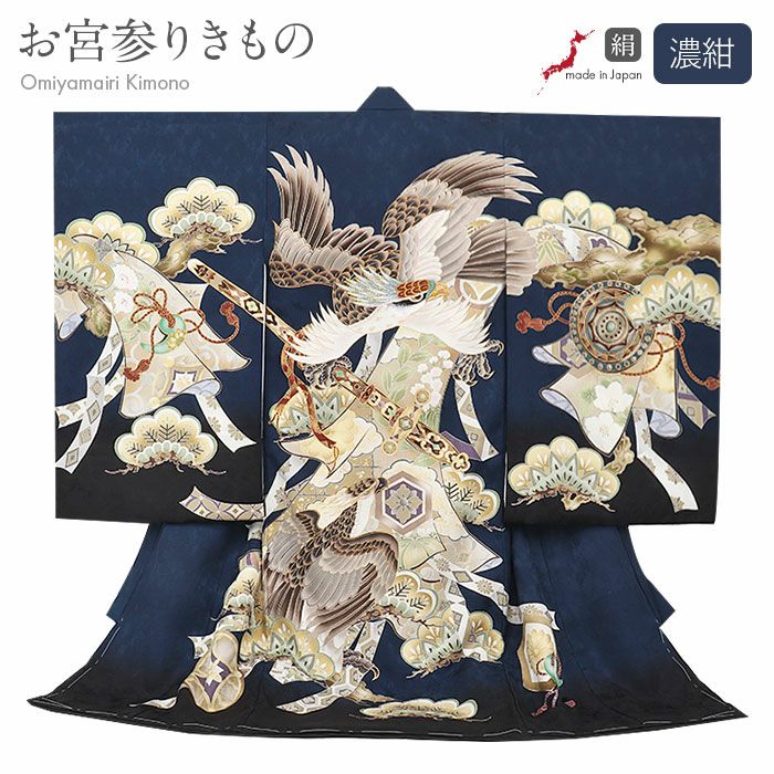 ≪在庫限り≫ 男の子 赤ちゃんのお宮参りの着物 お宮参り 着物 男の子 絹 正絹 掛け着 産着 紺 青 鷹 兜 甲冑 武具 色紙紋 飛翔 松竹梅 三段松 吉祥紋 友禅 刺繍 金彩 金たたき 新品 販売 購入 きもの 祝い着