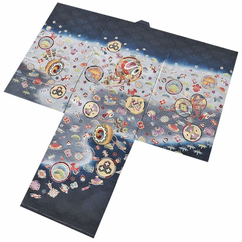 ≪在庫限り≫ 男の子 赤ちゃんのお宮参りの着物 お宮参り 着物 男の子 絹 正絹 掛け着 産着 紺 兜 鏡裏文 鼓 軍配 鞍橋 馬具 松竹 立波 吉祥紋 友禅 刺繍 金彩 新品 販売 購入 きもの 祝い着