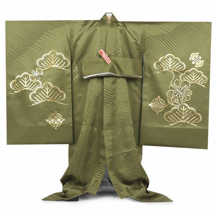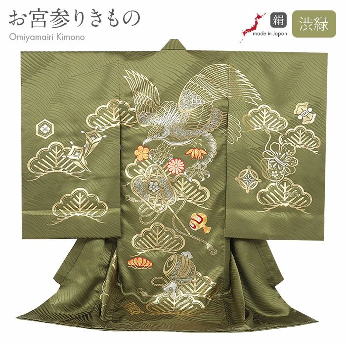 祝い着にふさわしい美しい正絹友禅 お宮参り 着物 男の子 産着 祝い着 渋緑 緑 抹茶 金 鷹 軍配 小槌 松 宝尽くし 吉祥紋 正絹 友禅 金駒刺繍 金彩 銀彩 新品 日本製