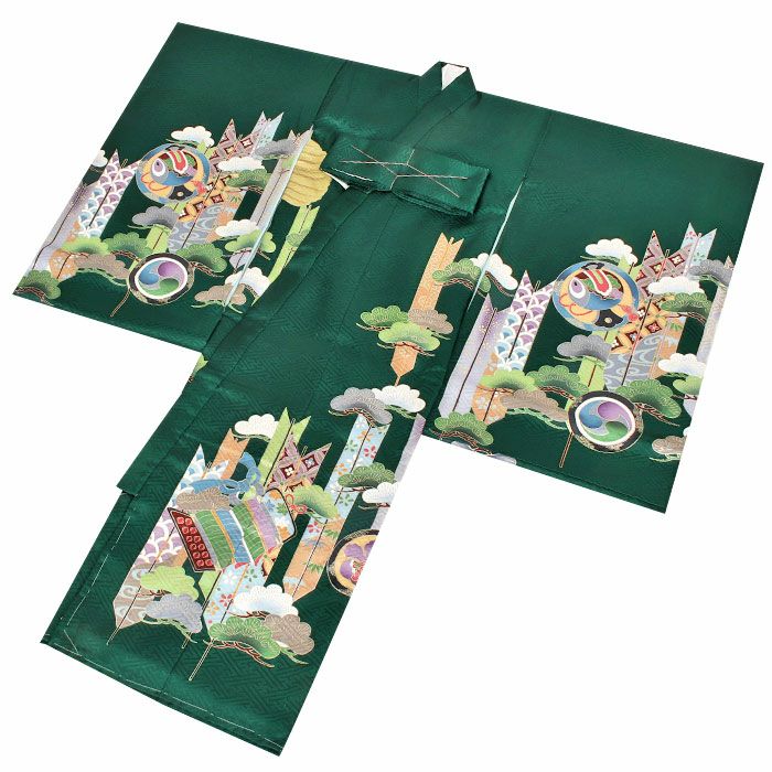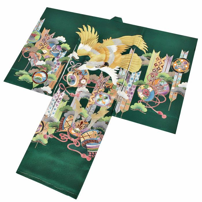 祝い着にふさわしい美しい正絹友禅 お宮参り 着物 男の子 産着 祝い着 緑 金 鷹 兜 小槌 太鼓 矢 軍配 武具 宝尽くし 吉祥紋 正絹 友禅 金刺繍 金彩 銀彩 箔づかい 新品 日本製 販売