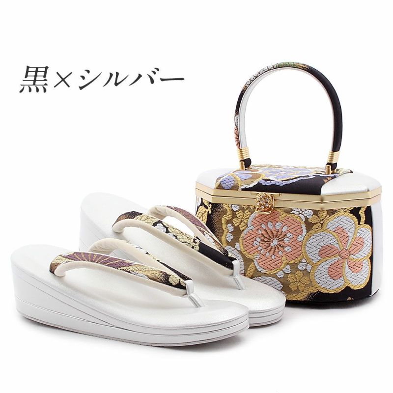 成人式や結婚式の華やかな振袖にぴったり 草履バッグセット 成人式 振袖用 キステオリジナル Sサイズ Mサイズ Lサイズ LLサイズ 黒 白 銀 アラベスク 西陣織 4枚芯 ハイヒール 厚底