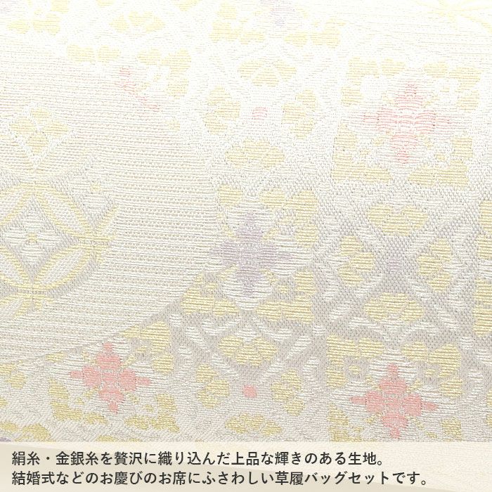 痛くなくて歩きやすい4枚芯の草履 留袖用草履バッグセット 訪問着用 彩小径 フリー Lサイズ クリーム ホワイト ピンク ゴールド シャンパン 花七宝 正絹袋帯地 凛華錦 4枚芯 日本製