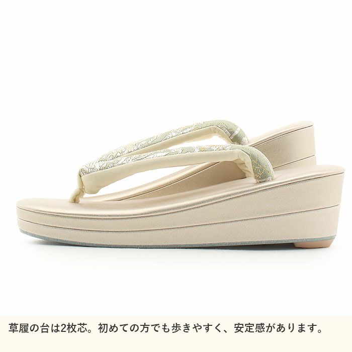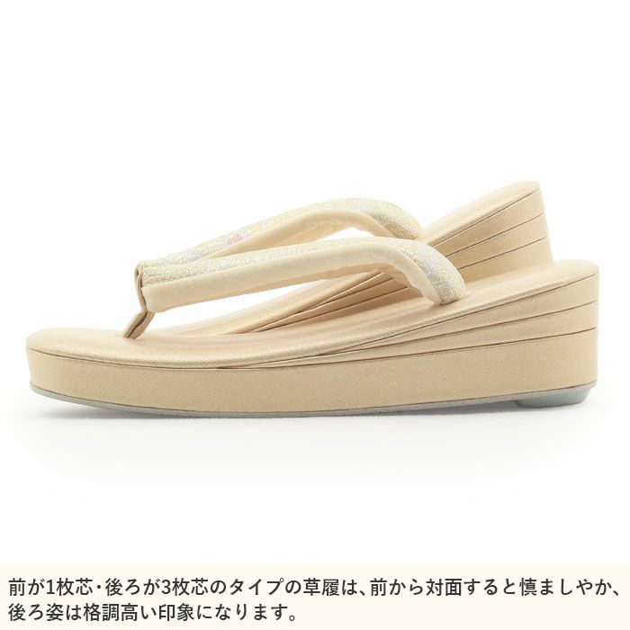 痛くなく歩きやすい、初めての方にも安心の履き心地 草履 留袖 訪問着 礼装用 レディース Mサイズ シャンパンゴールド 金 本革 本皮 型押し 螺鈿細工 幾何学 金銀たたき 2の3枚芯 日本製 優花緒
