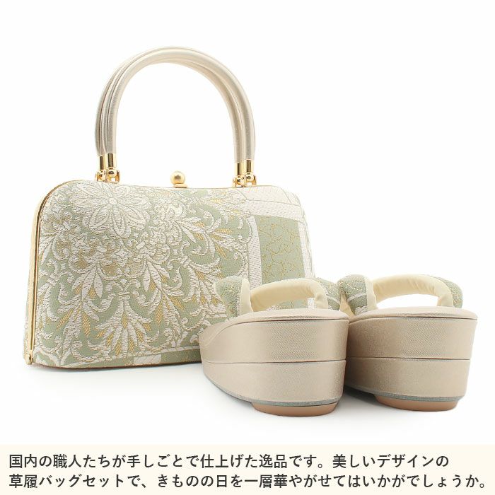 成人式や結婚式の華やかな振袖にぴったり 草履バッグセット 成人式 振袖用 キステオリジナル Sサイズ Mサイズ Lサイズ LLサイズ 金 緑 華紋 帯地 4枚芯 ハイヒール 厚底