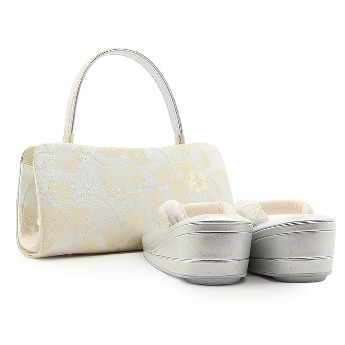 ≪在庫限り≫ 結婚式の黒留袖 色留袖や訪問着に 草履バッグセット 留袖用 訪問着用 草履バッグ 世美庵 M シャンパンシルバー 銀 クリーム 辻が花 本革 型押し 3枚芯 優花緒 日本製