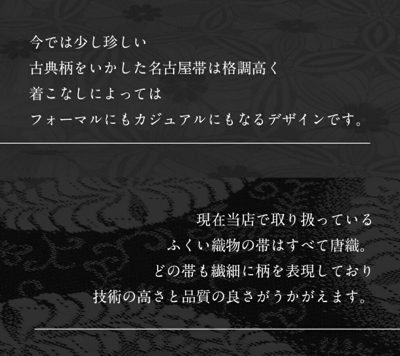 《お仕立て上り・送料込》【最短日お届け】小紋 紬 色無地 御召 などのお着物に 名古屋帯 博多帯 博多織 帯 八寸 黒 献上 唐花 筑前織物 正絹 仕立て上がり