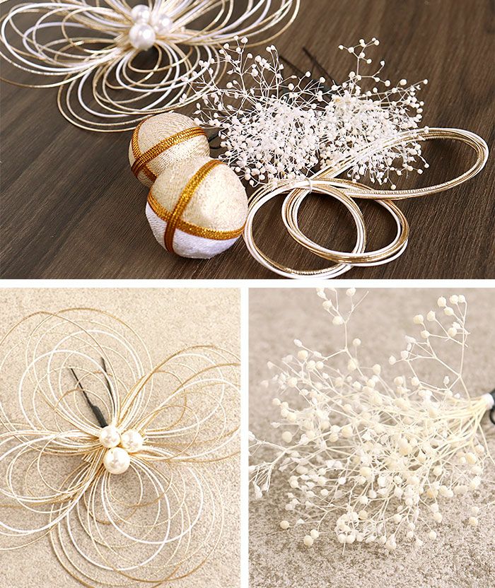 成人式や結婚式の華やかな振袖や卒業袴に合わせたい 髪飾り 成人式 振袖用 成人用 Watmospher ベージュ 水色 ホワイト ゴールド 花 ゆり 水引き パール 日本製