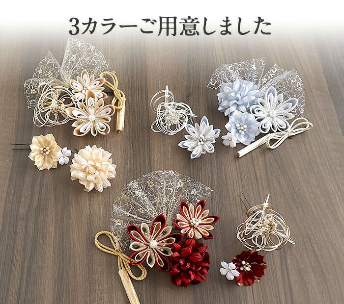 成人式や結婚式の華やかな振袖や卒業袴に 髪飾り 成人式 振袖用 成人用 花ごころ レッド ホワイト ブルー 3色展開 花 水引き ロープ チュール リボン 玉飾り 日本製 七五三 振袖 卒業袴 振り袖
