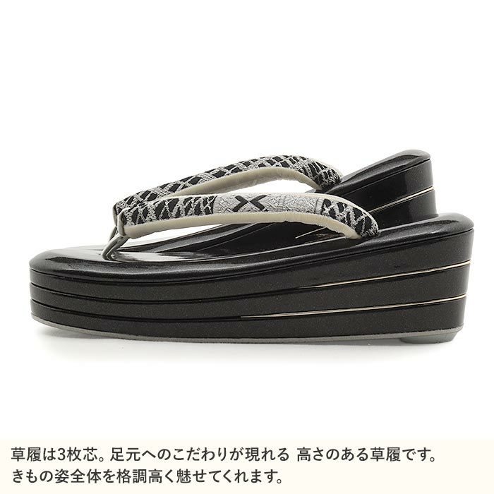 ≪在庫限り≫ 成人式や結婚式の華やかな振袖や卒業袴に 草履 成人式 振袖用 成人用 レディース 紗織 沙織 L 黒 シルバー 銀 格子 菱柄 帯地 合皮 3枚芯かかと高め 日本製 振袖 卒業袴 振り袖 ママ振