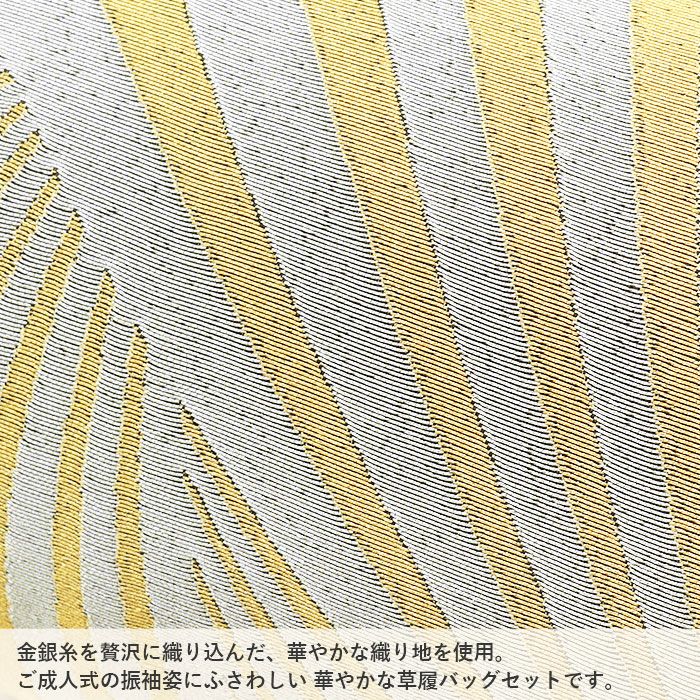 歩きやすい優花緒、初めての方にも安心の履き心地 草履バッグセット 成人式 振袖用 卒業袴 成人用 Sサイズ 金 ゴールド ホワイト 華紋 正絹帯地 2枚芯 優花緒 日本製