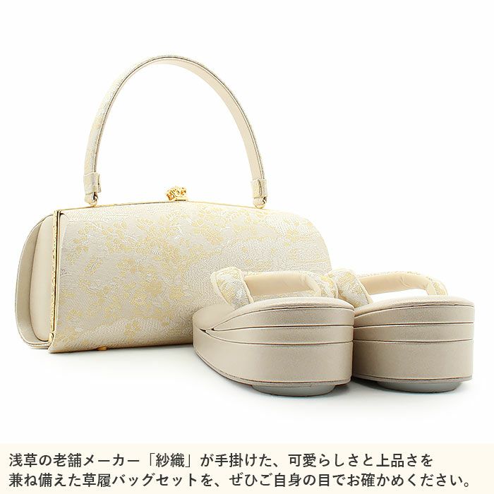 痛くなくて歩きやすい、初めての方にも安心の履き心地 草履バッグセット 留袖用 訪問着用 ハイヒール 厚底 結婚式 草履 バッグ 留袖 Sサイズ 小さい ベージュ 七宝 花菱 京都 西陣 キステオリジナル 日本製