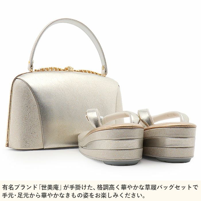 ≪在庫限り≫ 結婚式の黒留袖 色留袖や訪問着に 草履バッグセット 留袖用 訪問着用 草履バッグ 世美庵 M シャンパンシルバー 銀 クリーム 辻が花 本革 型押し 3枚芯 優花緒 日本製