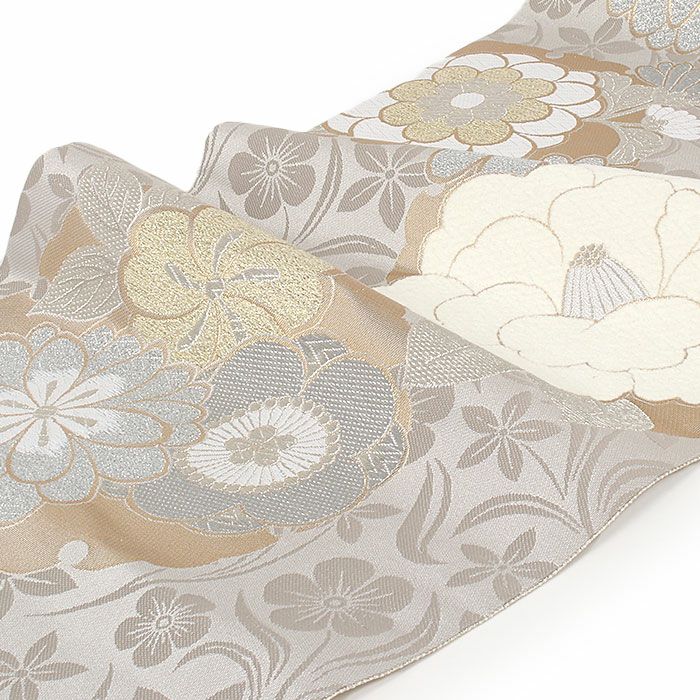 ≪在庫限り≫振袖 はもちろん 留袖 や 訪問着 にも 袋帯 振袖用 成人式 グレージュ 金 銀 雪輪 牡丹 華紋 西陣織 京都イシハラ 仕立て上がり 新品 帯単品 おび 結婚式 成人式