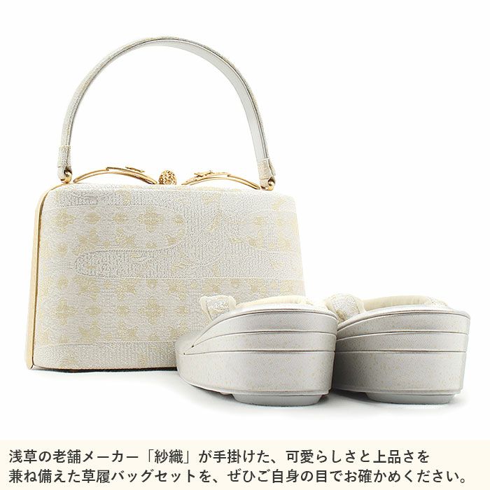 ≪在庫限り≫ 結婚式の黒留袖 色留袖や訪問着に 草履バッグセット 留袖用 訪問着用 草履バッグ 世美庵 M 白 ホワイト シルバー シャンパンゴールド 菊七宝 帯地 3枚芯 優花緒 日本製