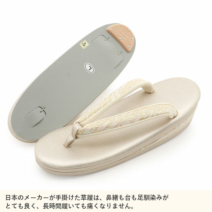 痛くなく歩きやすい、初めての方にも安心の履き心地 草履 留袖 訪問着 礼装用 レディース Lサイズ シャンパンゴールド 金 本革 本皮 型押し 螺鈿細工 幾何学 金銀たたき 2の3枚芯 日本製 優花緒