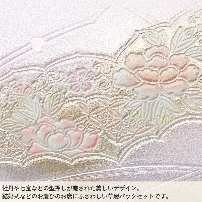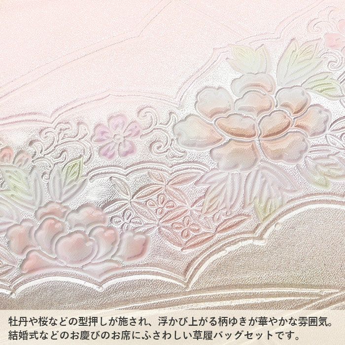 ≪在庫限り≫ 結婚式の黒留袖 色留袖や訪問着に 草履バッグセット 留袖用 訪問着用 草履バッグ フリー L ピンク シルバー 桃 銀 牡丹 七宝 型押し エナメル 1の2枚芯 日本製