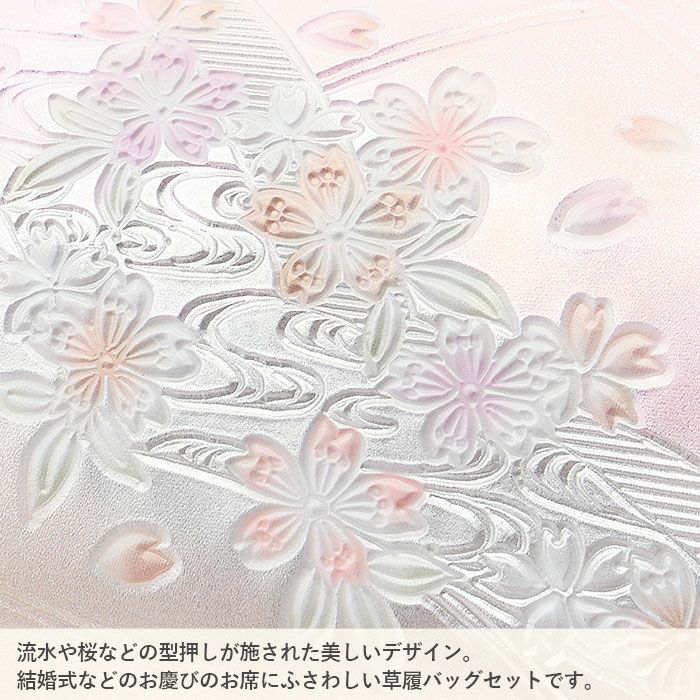≪在庫限り≫ 結婚式の黒留袖 色留袖や訪問着に 草履バッグセット 留袖用 訪問着用 草履バッグ フリー L ピンク シルバー 桜 流水 型押し エナメル 1の2枚芯 日本製