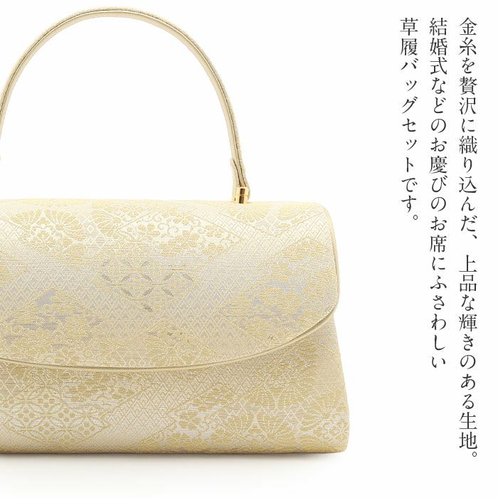 ≪在庫限り≫ 結婚式の黒留袖 色留袖や訪問着に 草履バッグセット 留袖用 訪問着用 草履バッグ 彩小径 Mサイズ ゴールド シャンパンゴールド 金 立涌 華紋 唐花 正絹 帯地 3枚芯 日本製