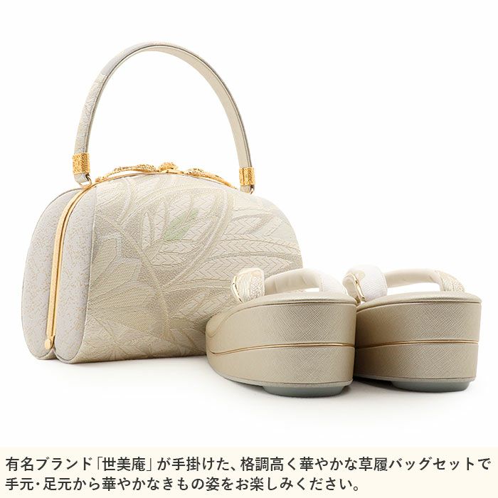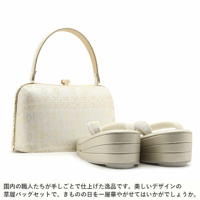 ≪在庫限り≫ 成人式や結婚式の華やかな振袖に 成人式 草履バックセット 振袖 草履バッグセット 草履 バッグ 世美庵 華三彩 M シルバー アイボリー 灰 唐花模様 帯地 2枚芯 日本製