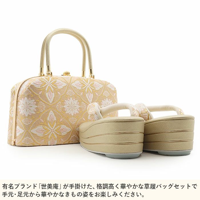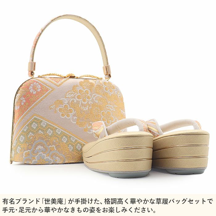 痛くない 歩きやすい、初めての方にも安心の履き心地 【アウトレット】 草履バッグセット 留袖用 訪問着用 草履バッグ 世美庵 L シャンパンゴールド アイボリー ピンク 帯地 3枚芯 優花緒 日本製