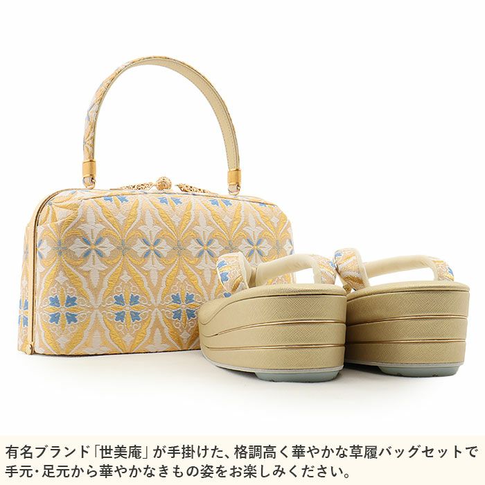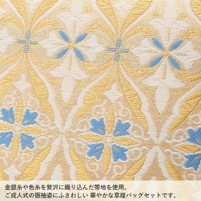 ≪在庫限り≫ 成人式や結婚式の華やかな振袖に 成人式 草履バックセット 振袖 草履バッグセット 草履 バッグ 世美庵 L ゴールド 金 ホワイト 青 アラベスク 変わり立涌 帯地 3枚芯 日本製