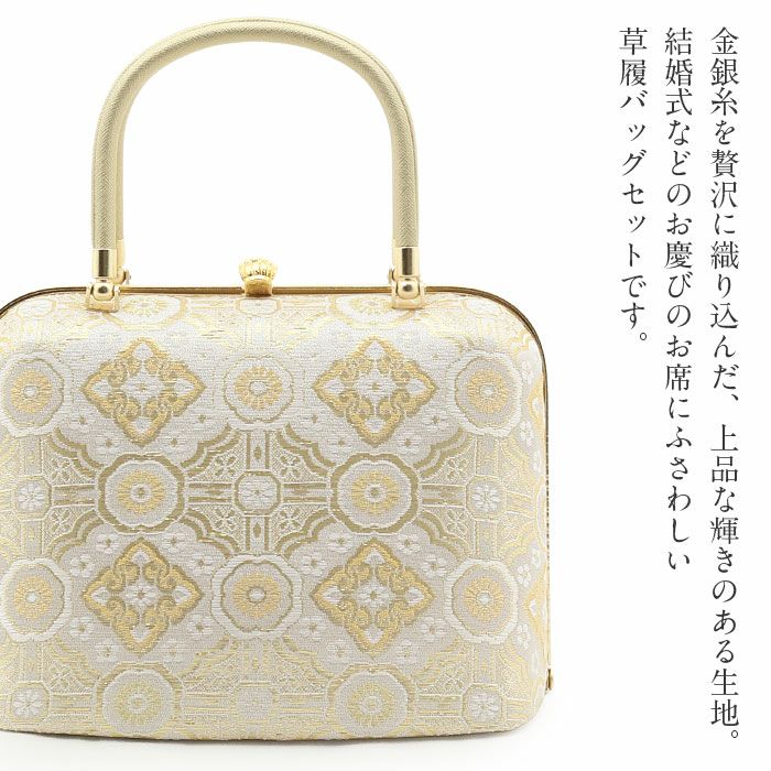 ≪在庫限り≫ 結婚式の黒留袖 色留袖や訪問着に 草履バッグセット 留袖用 訪問着用 草履バッグ フリー L シルバー ホワイト ベージュゴールド 菱華紋 絹 西陣織 帯地 2枚芯