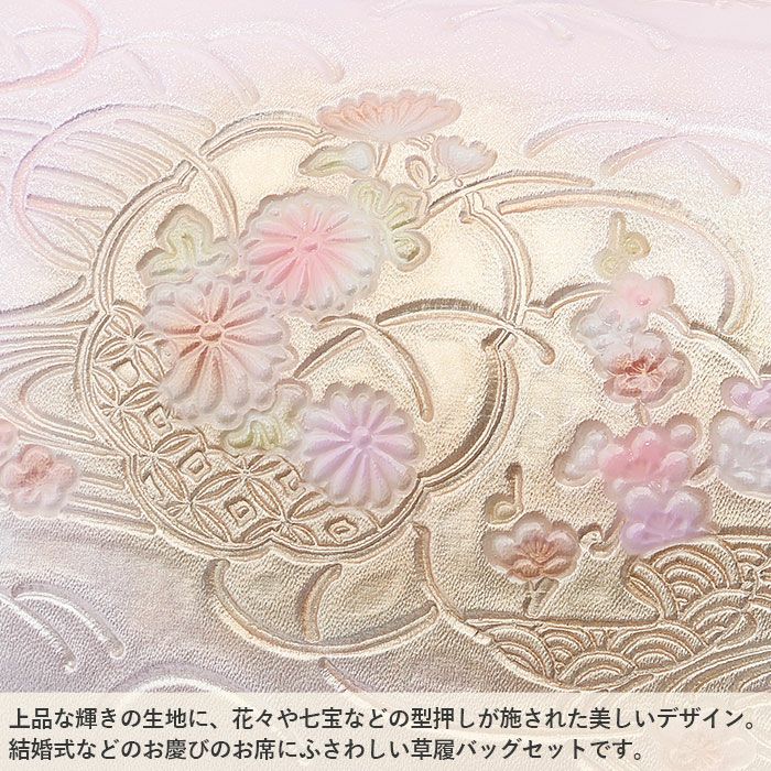 ≪在庫限り≫ 結婚式の黒留袖 色留袖や訪問着に 草履バッグセット 留袖用 訪問着用 草履バッグ フリー L ピンク シルバー 桃 銀 万寿菊 梅 花々 七宝 流水 型押し エナメル 1の2枚芯 日本製