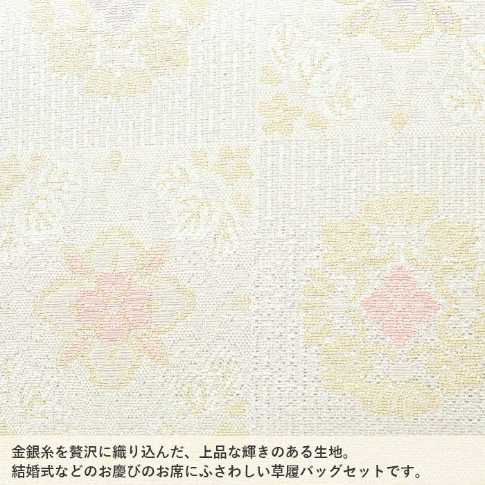痛くなくて歩きやすい4枚芯の草履 留袖用草履バッグセット 訪問着用 彩小径 フリー Lサイズ クリーム ホワイト ピンク ゴールド シャンパン 花七宝 正絹袋帯地 凛華錦 4枚芯 日本製
