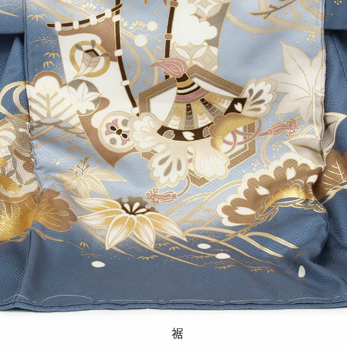 祝い着にふさわしい美しい正絹友禅 お宮参り 着物 男の子 産着 祝い着 青灰 白 兜 軍配 三つ矢 旗印 六つ矢車 小槌 松 流水 宝尽くし 正絹 友禅 刺繍 金彩 新品 日本製