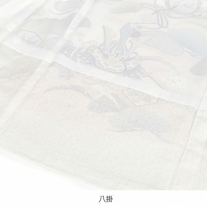 ≪在庫限り≫ 男の子 赤ちゃんのお宮参りの着物 お宮参り 着物 男の子 絹 正絹 掛け着 産着 白銀 薄水色 兜 熨斗 几帳 小槌 鼓 軍配 甲冑 三つ矢 武具 宝尽くし 吉祥紋