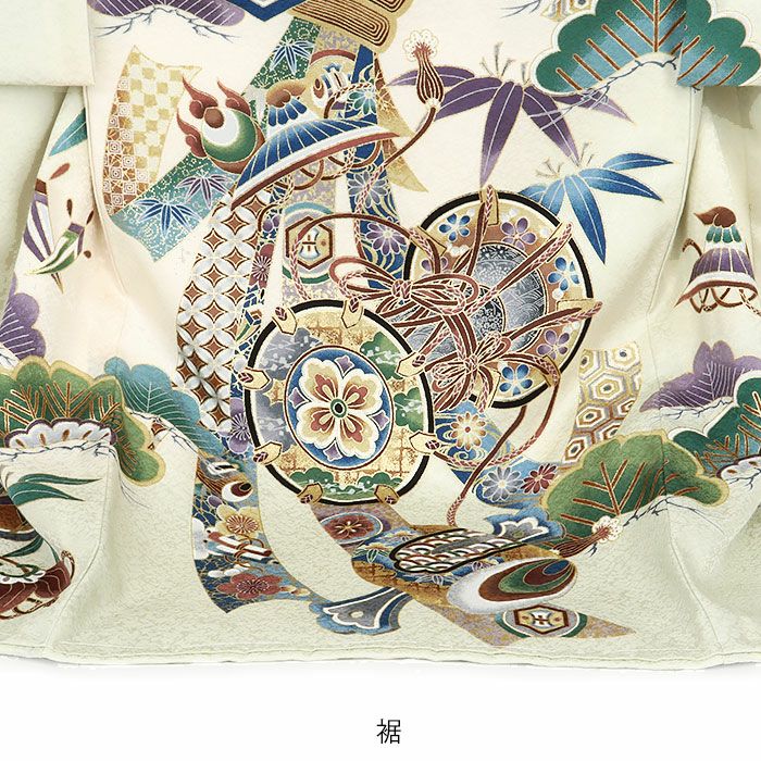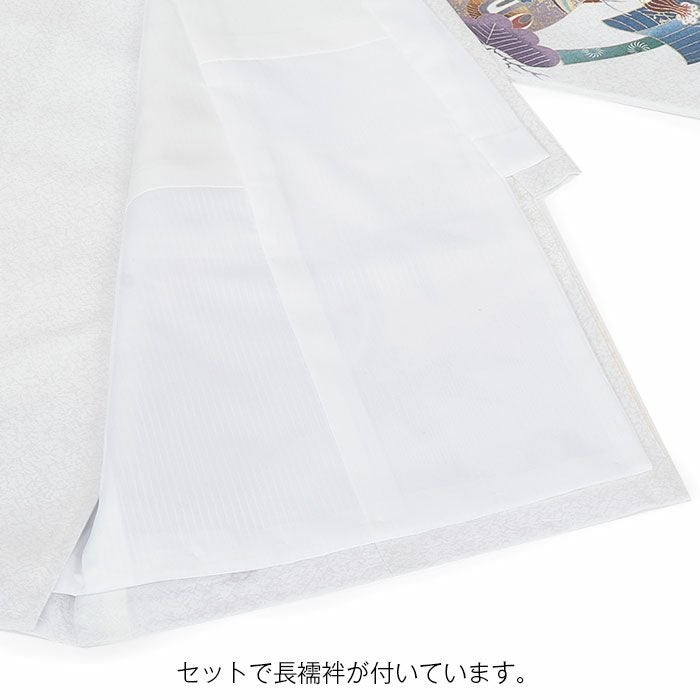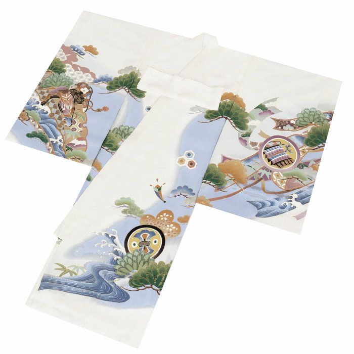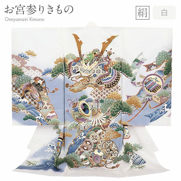 ≪在庫限り≫ 男の子 赤ちゃんのお宮参りの着物 お宮参り 着物 男の子 絹 正絹 掛け着 産着 白 兜 甲冑 鞍橋 馬具 武具 纏 熨斗 青海波 立波 小槌 宝尽くし 吉祥紋