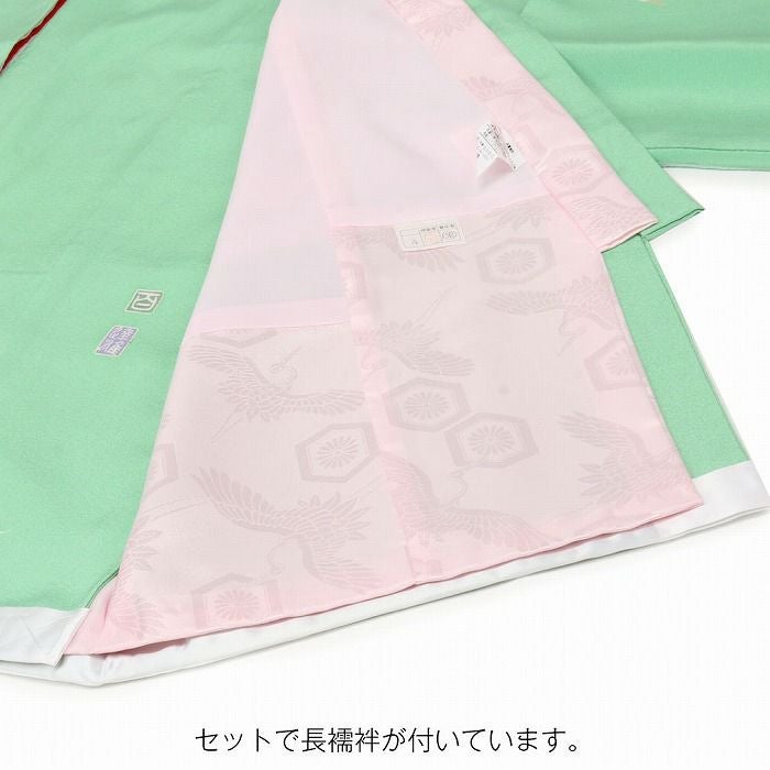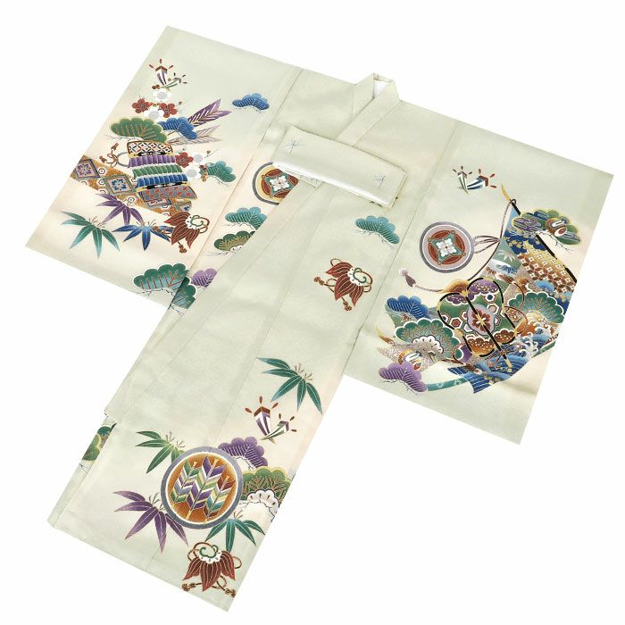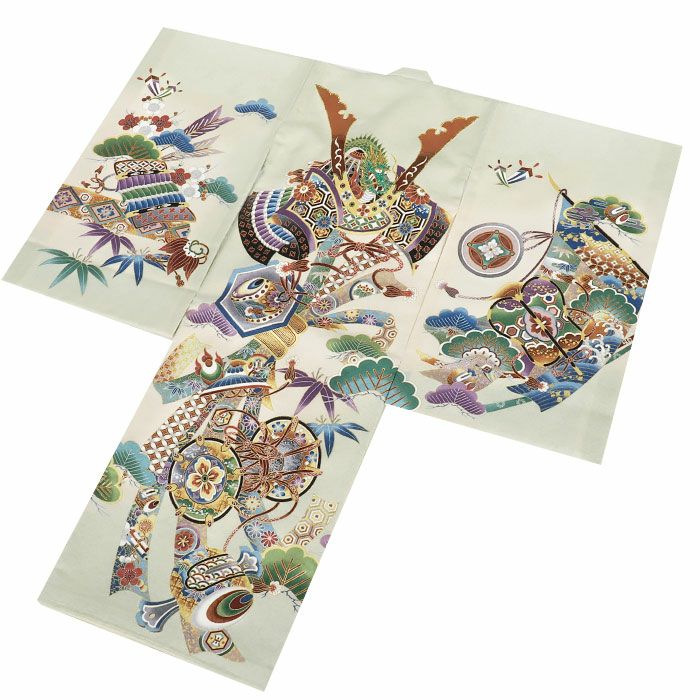 ≪在庫限り≫ 男の子 赤ちゃんのお宮参りの着物 お宮参り 着物 男の子 絹 正絹 掛け着 産着 薄緑 兜 熨斗 几帳 小槌 鼓 軍配 甲冑 三つ矢 武具 宝尽くし 吉祥紋 友禅