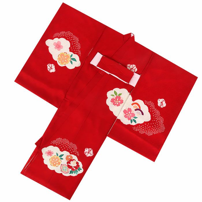 女の子 赤ちゃんのお宮参りの着物 産着 お宮参り 着物 女の子 絹 正絹 掛け着 産着 赤 鞠 八重桜 花扇 扇 桜 梅 疋田 鹿の子 吉祥花 友禅 金駒刺繍 金彩 新品