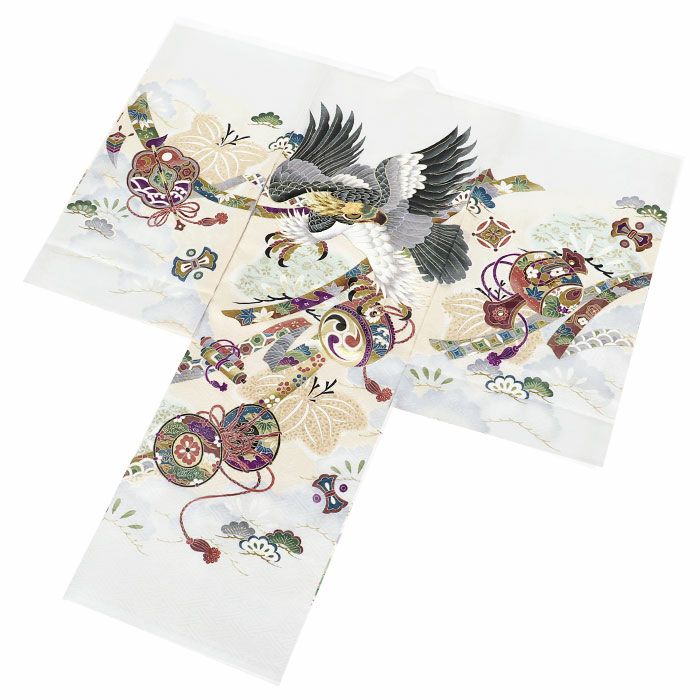 ≪在庫限り≫ 男の子 赤ちゃんのお宮参りの着物 お宮参り 着物 男の子 絹 正絹 掛け着 産着 モダン 白 鷹 兜 隠れ笠 鐙 馬具 軍配 宝尽くし 吉祥紋 友禅 銀駒刺繍 銀彩 ぼかし 新品 日本製