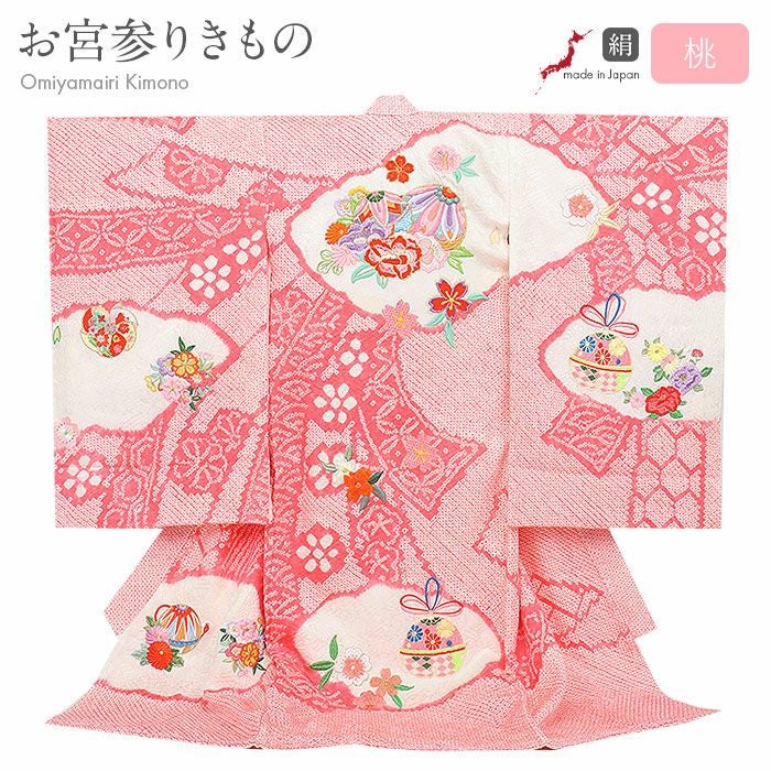 ≪在庫限り≫ 女の子 赤ちゃんのお宮参りの着物 お宮参り 着物 女の子 絹 正絹 掛け着 産着 ピンク 桃 鞠 熨斗 鈴 牡丹 桜 吉祥紋 友禅 疋田 鹿の子 本絞り 絞り 刺繍 新品 日本製