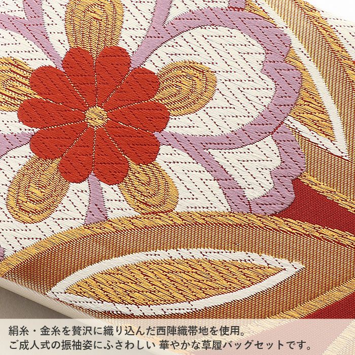 ≪在庫限り≫ 成人式や結婚式の華やかな振袖に 成人式 草履バックセット 振袖 草履バッグセット 草履 バッグ 世美庵 4サイズ展開 S M L LLサイズ ゴールド 金 白 朱赤 華紋 花文 振袖用帯地 3枚芯 日本製