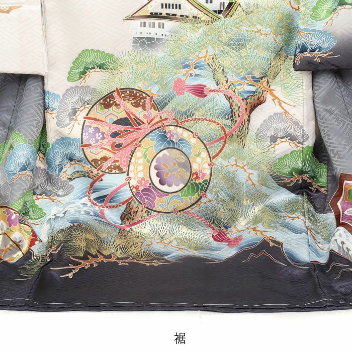 男の子 赤ちゃんのお宮参りの着物 産着 お宮参り 着物 男の子 絹 正絹 掛け着 産着 祝い着 灰 鷹 城 小槌 扇 宝尽くし 松 竹 吉祥紋 友禅 京友禅 金刺繍 金彩 箔づかい 新品 日本製