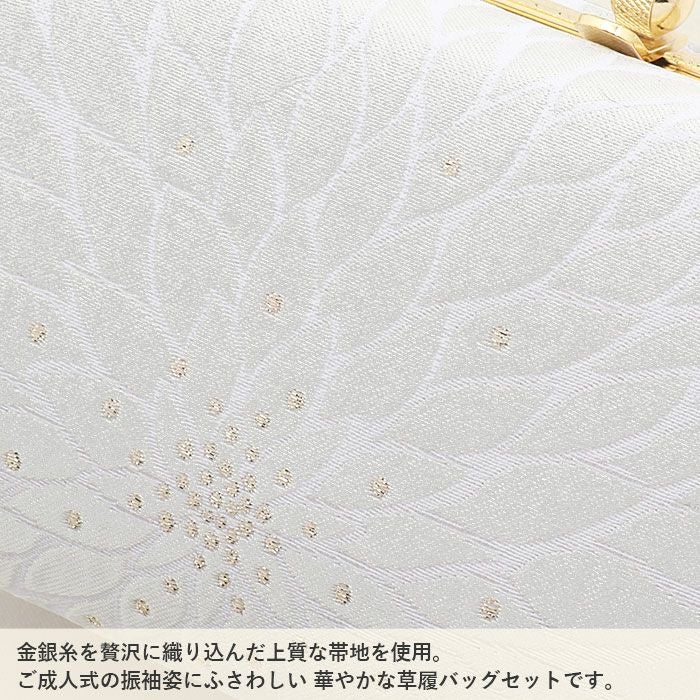 痛くなく歩きやすい、初めての方にも安心の履き心地 成人式 振袖 草履バッグセット 草履 バッグ フリー L ホワイト シルバー 白 銀 万寿菊 帯地 2枚芯 日本製
