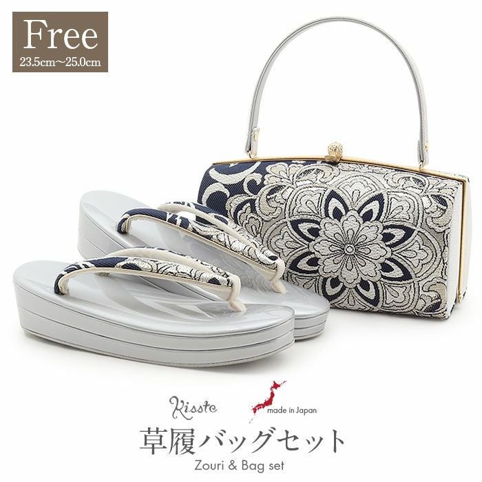 痛くなく歩きやすい、初めての方にも安心の履き心地 成人式 振袖 草履バッグセット 草履 バッグ フリー L ネイビー シルバー 紺 銀 薄金 白 華紋 振袖用帯地 エナメル 2枚芯 日本製