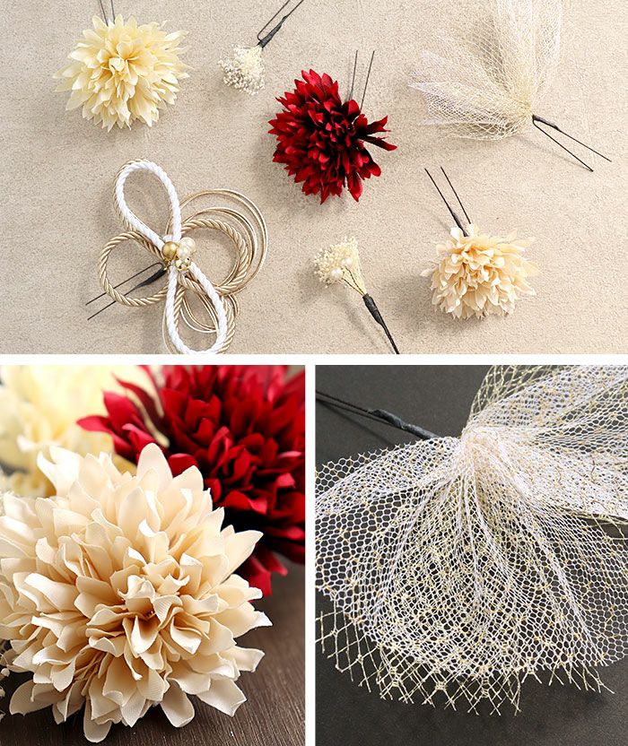 成人式や結婚式の華やかな振袖や卒業袴に 髪飾り 成人式 振袖用 成人用 花ごころ レッド ホワイト ブルー 3色展開 花 水引き ロープ チュール リボン 玉飾り 日本製 七五三 振袖 卒業袴 振り袖