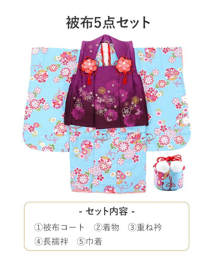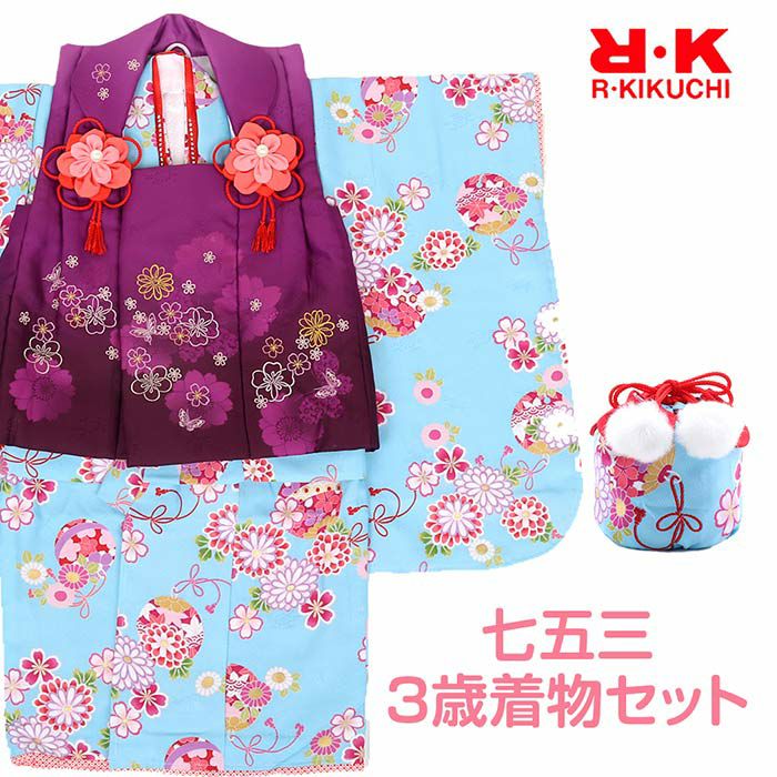 《値下げ!》七五三 着物 3歳 女の子 販売 被布セット 5点 水色 紫 桜 菊 鞠 リョウコ キクチ ブランド