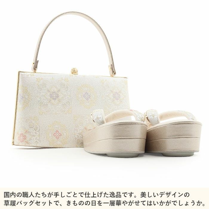 ≪在庫限り≫ 成人式や結婚式の華やかな振袖に 成人式 草履バックセット 振袖 草履バッグセット 草履 バッグ 世美庵 華三彩 M シルバー アイボリー 灰 唐花模様 帯地 2枚芯 日本製