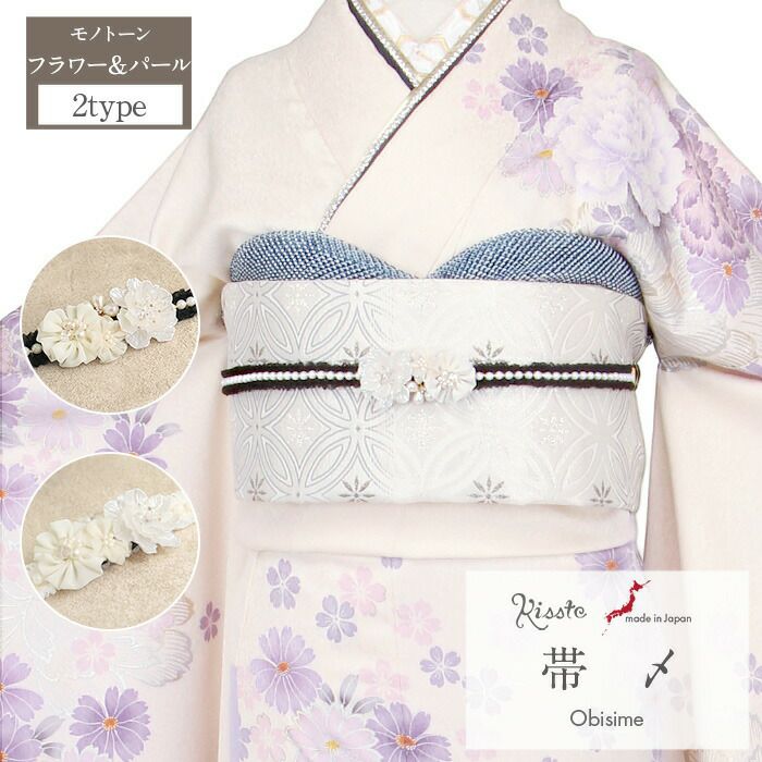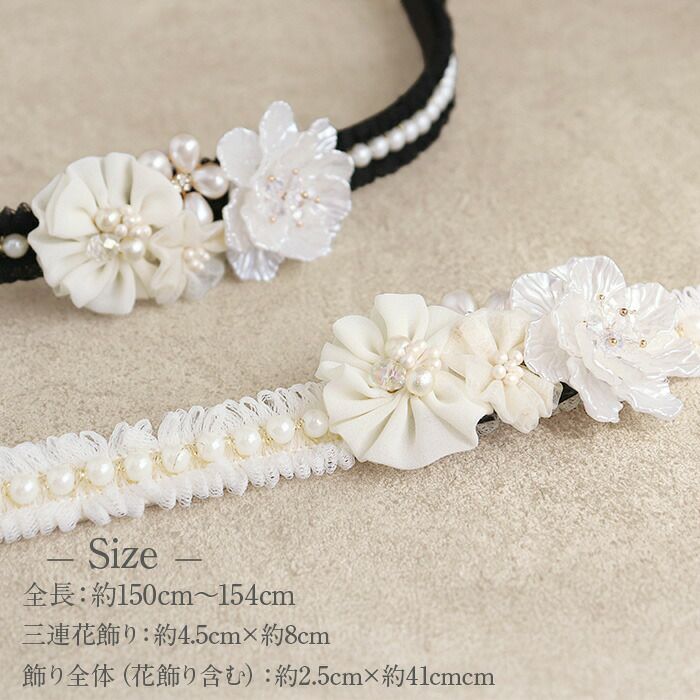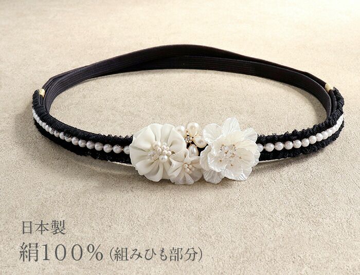 上質な絹100%の組紐に、小粒パールを贅沢にあしらいました 帯締め 成人式 振袖用 成人用 ブラック ホワイト 黒 白 モノトーン 2タイプ 2カラー パール フラワー 三連花飾り 正絹 シルク 日本製
