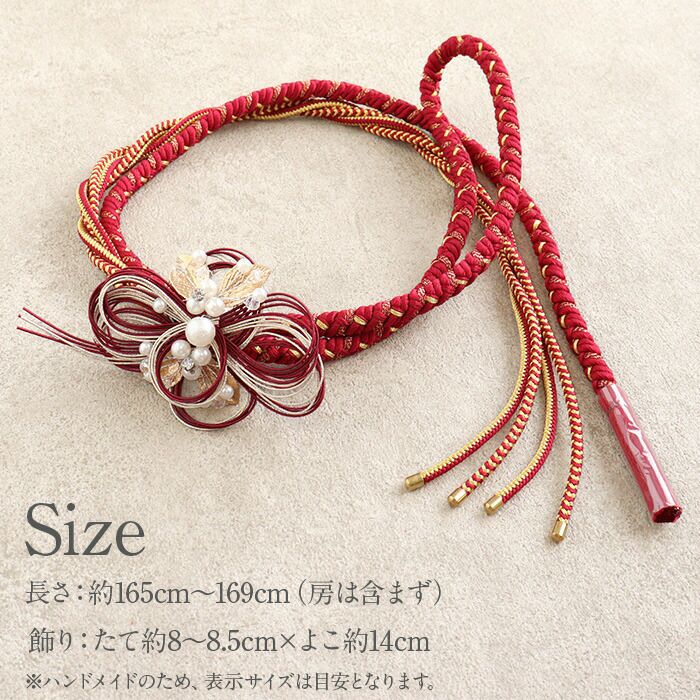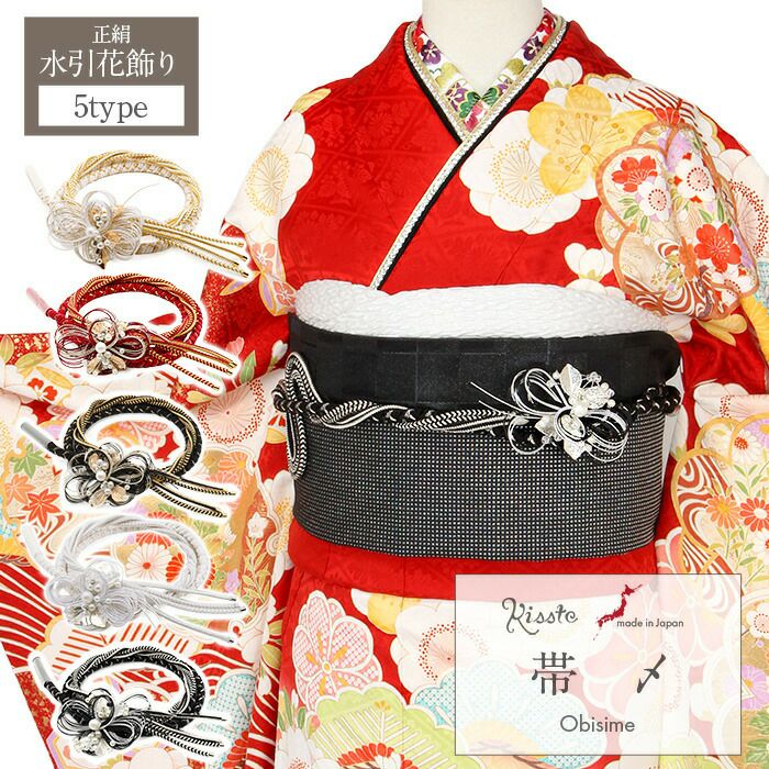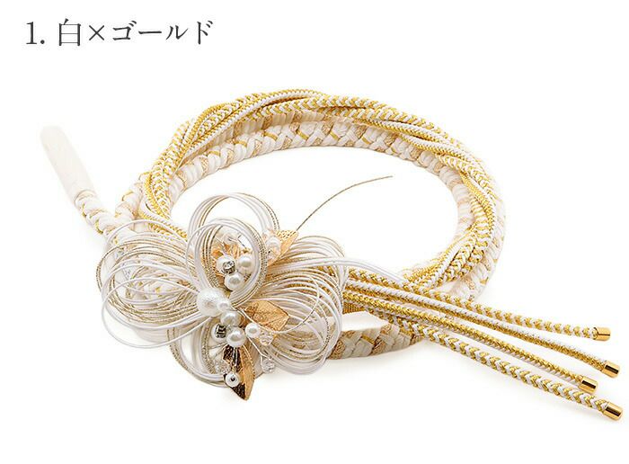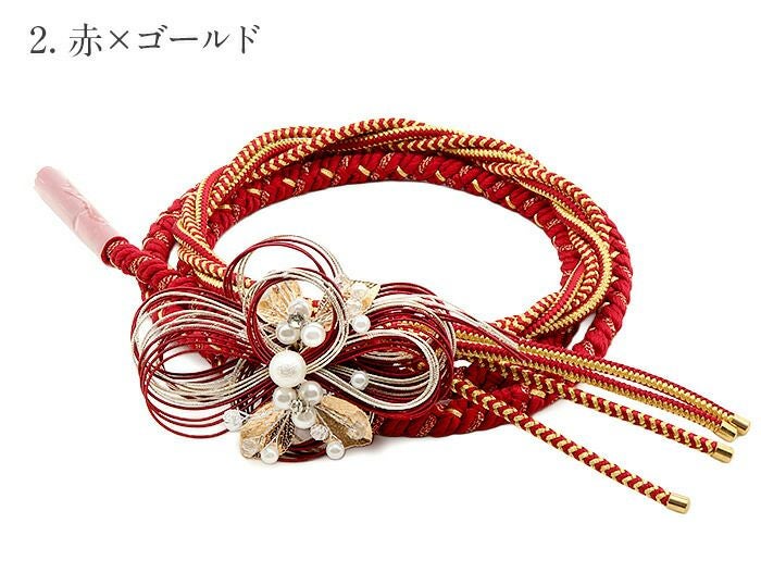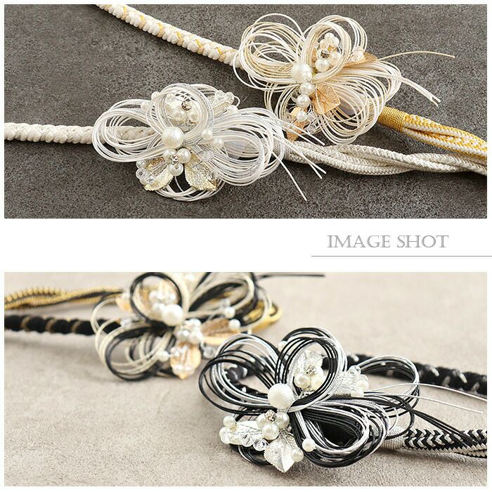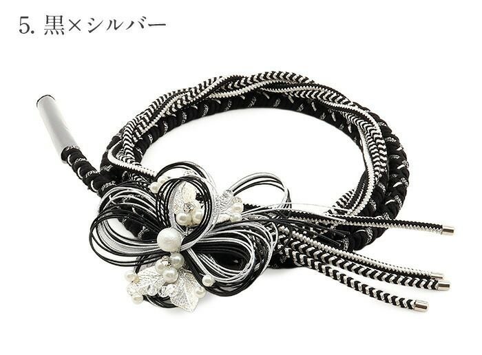 上質な絹100%の組紐に、水引とパールビーズを組み合わせました 帯締め 成人式 振袖用 成人用 ブラック ホワイト レッド 黒 白 赤 ゴールド シルバー モノトーン 5Type 水引 パール フラワー 正絹 シルク 日本製